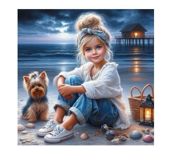 Diamentowa Mozaika Dziewczynka siedząca z pieskiem na plaży 30x40 cm
