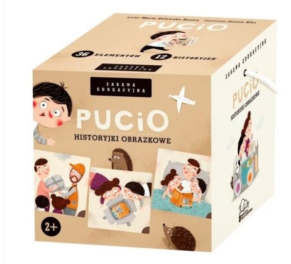 Zabawka edukacyjna Pucio. Historyjki obrazkowe składa się z 36 obrazków, z których można ułożyć 12 historyjek (każdą tworzą 3 obrazki). Kierujemy ją do dzieci, które ukończyły 2. rok życia. Do zestawu dołączona jest instrukcja.