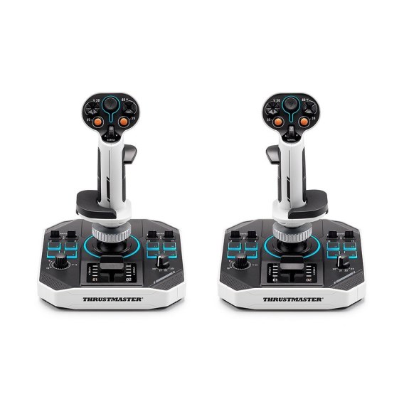 Oburęczne joysticki z łączną liczbą 88 przycisków, 16 osi, 4 spustów, 2 mini-sticków i 2 kółek przewijania.