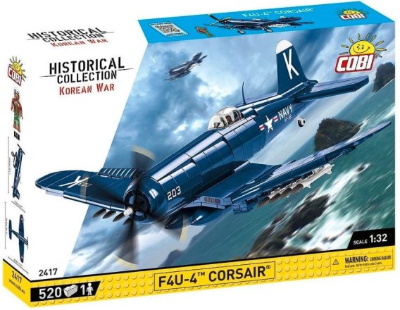Zestaw Vought F4U-4 Corsair został wydany na licencji posiadającego prawa do tego modelu koncernu Northrop-Grumman i zawiera 520 wysokiej jakości elementów. Figurka historycznego pilota została wzbogacona o dodatkową główkę, którą można montować zamiennie. Model samolotu myśliwskiego od firmy COBI został stworzony z dbałością o najdrobniejsze detale w skali 1:32. Jest pokryty wysokiej jakości nadrukami, które nie ścierają się nawet podczas intensywnego użytkowania. Kabina otwiera się i można w niej umieścić figurkę. Inne ruchome elementy to lotki, śmigło i składane koła. Nadrukowane oznaczenia nawiązują do bohaterskiego pilota z wojny w Korei. Samolot można umieścić na klockowej podstawce ekspozycyjnej. Całość zestawu uzupełnia tabliczka ekspozycyjna z nadrukowaną nazwą modelu samolotu. Corsair od COBI doskonale uzupełnia ofertę samolotów z okresu drugiej wojny światowej i wojny w Korei wydanych w skali 1:32. Jest to jeden z najpiękniejszych klockowych modeli, który zawsze przyciąga uwagę za sprawą niezwykle charakterystycznego wyglądu łamanych i składanych skrzydeł.