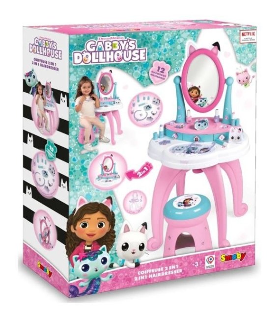 Toaletka z lustrem z wizerunkiem Gabi i stołeczkiem. W zestawie z 12 akcesoriami, w tym pomadki, maskara, lakiery do paznokci, pojemniczki, grzebyk, opaski do włosów. Wszystkie produkty nie są prawdziwymi kosmetykami. Wyprodukowane we Francji.