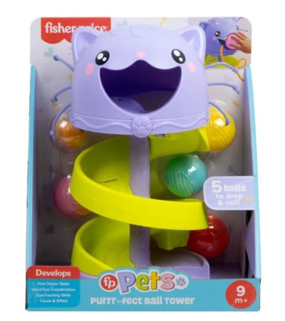 Maluchy pokochają dynamiczną zabawę w toczenie kuleczek z Kociej wieży FP Pets od Fisher-Price. Zabawka dla dzieci w kształcie wieży z uroczym kotkiem na szczycie pozwala karmić kotka 4 łatwymi do trzymania w rączce kuleczkami włóczki i 1 rybką-grzechotką. Maluszek wrzuca je do pyszczka zwierzątka i obserwuje, jak toczą się w dół po spiralnym torze. Tę wesołą zabawę można powtarzać bez końca! Ta zabawka to świetny sposób na wzmacnianie zręczności szkraba i uczenie go zasady przyczyny i skutku. Kolory i elementy dekoracyjne mogą się różnić.