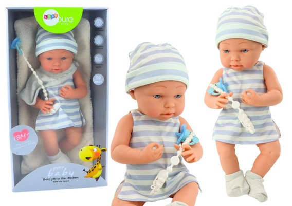 Lalka Bobas w Biało-Niebieskim Ubranku Czapeczka Smoczek Śliniaczek Kołderka