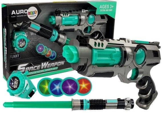 Przedstawiamy niesamowity zestaw kosmicznej broni, który jest idealnym rekwizytem do stoczenia walki z groźnym wrogiem z odległej planety. Ta niespotykana, oryginalna broń posiada kosmiczne dźwięki i światła, co z pewnością zachęci do zabawy wszystkie dzieciaki. Kosmiczny środek bojowy składa się z wielu elementów. Kolorystyka zestawu składa się z kolorów: srebrny, czarny, turkusowy. Pistolet po wciśnięciu spustu świeci się i wydaje dźwięki, dlatego warto wypróbować zabawkę w ciemnym pomieszczeniu. Dodatkowy element, czyli miotacz dysków można założyć na rękę i umieścić w nim dyski znajdujące się w zestawie i wystrzeliwać nimi w przeciwnika.