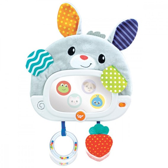 Mięciutki króliczek z możliwością mocowania do szczebli łóżeczka z bezpiecznym lustereczkiem na brzuszku. Lusterko ma efekty świetlne, cztery ukryte obrazki oraz melodie i piosenki odpowiednie dla trybu dnia i nocy. W trybie nocy łagodne odgłosy natury i spokojne melodyjki ułatwiające zasypianie. Dołączone grzechotki do pociągania w kształcie kółka i owocu i szeleszczące uszka to kolejna zaleta naszego króliczka. Zabawka ma wygodną podstawkę która umożliwia zabawę na podłodze.