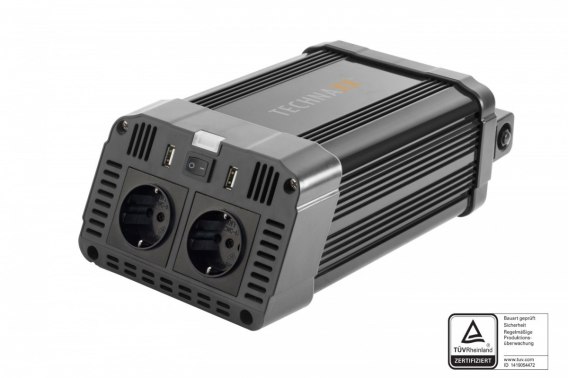 Przetwornica (falownik) o mocy ciągłej 1.200W (2x VAC 230V / 2x USB) Technaxx TE16 Do ładowania różnych urządzeń elektronicznych w samochodzie, kamperze, na łodzi.