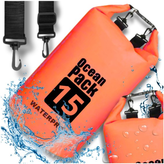 Wodoodporny worek o pojemności 15 litrów, przeznaczony do transportu bagażu, odzieży, dokumentów i innych osobistych rzeczy.