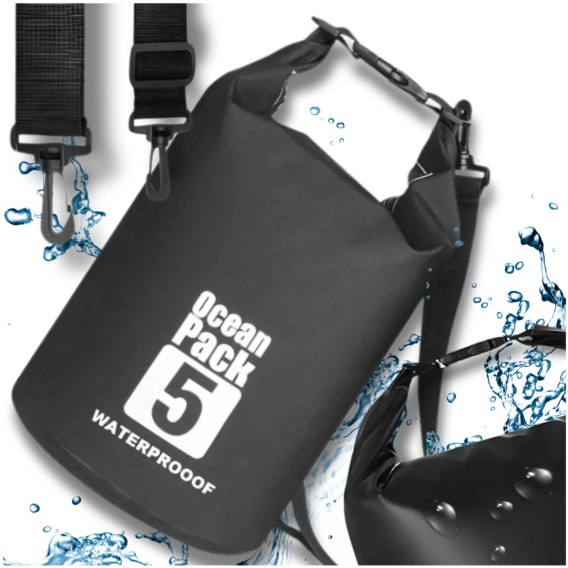 Wodoodporny worek o pojemności 5 litrów, przeznaczony do transportu bagażu, odzieży, dokumentów i innych osobistych rzeczy.