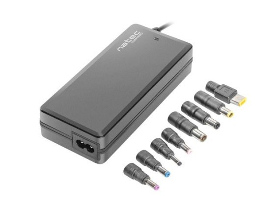 Natec Torpedo Uni-90 posiada w zestawie 8 wymienialnych końcówek kompatybilnych z większością laptopów o różnych napięciach wyjściowych z zapotrzebowaniem na moc do 90W.