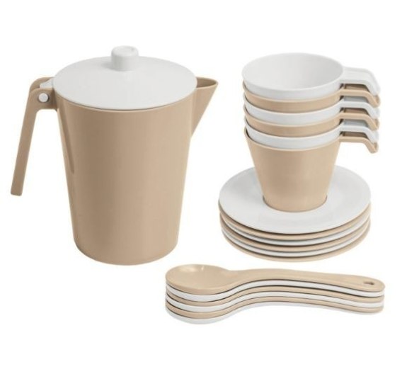 Serwis kawowy z serii Toys in Trends w kolorach jasnego beżu, mlecznej szarości oraz bieli to niezastąpiona zabawka dla każdego dziecka, które lubi bawić się w odgrywanie ról. Idealnie nadaje się na kameralne spotkanie na herbatkę dla 6 osób, a mała gospodyni będzie mogła w zabawny sposób nauczyć się zasad etykiety i nakrycia stołu. Zestaw składa się z 19 elementów: dzbanka, 6 filiżanek, 6 talerzyków, 6 łyżeczek. Zestaw jest starannie wykończony i bezpieczny w użytkowaniu naczynia są dopuszczone do kontaktu z żywnością, można używać ich w kuchence mikrofalowej i myć w zmywarce.
