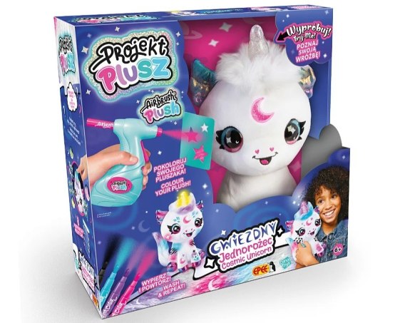 Gwiezdny Jednorożec to więcej niż plusz. Można go dekorować za pomocą dołączonego do zestawu aerografu lub markerów. Można zadać mu pytanie, na które odpowie, używając odpowiedniego koloru. Po zabawie Gwiezdnego Jednorożca można wyprać i stworzyć nowe stylizacje od początku.