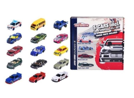 Zestaw 5 pojazdów w limitowanej edycji Japan series. Zawiera 5 pojazdów: 2 x pojazdy premium, 2 x pojazdy deluxe oraz 1 pojazd niespodzianka: ekskluzywny Nissan Skyline GT w jednym z trzech różnych malowań. Dodatkowo w zestawie akcesoria do tuningu pojazdów oraz pudełko do przechowywania. Skala 1:64, długość: 7,5 cm, 3l+