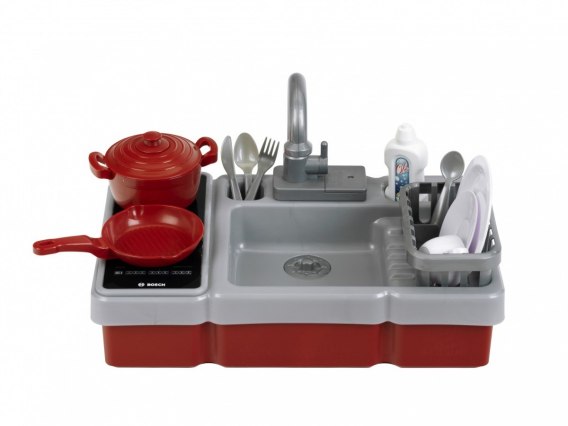 Ta kuchnia zmieści się nawet w najmniejszym pokoju dziecięcym! Oferuje wszystko, czego potrzebują mamy lalek i tatusie pluszowych misiów, aby opiekować się swoimi bliskimi. Wystarczy postawić garnek na płycie grzewczej, a efekty świetlne i dźwiękowe poinformują Cię, że cos się gotuje i skwierczy. Następnie ułóż wszystko na talerzach, połóż obok sztućce i nakarm lalki i misie. Czy wszyscy się najedli? Czas posprzątać ze stołu, włożyć naczynia do zlewu i napompować go wodą, aby rozpocząć zmywanie. Po umyciu naczynia trafiają do kosza, aby je osuszyć, podczas gdy świeże powietrze wszystko osusza, Twoje maluchy mają czas na nowe, pomysłowe zabawy. Mini kuchnia w popularnym designie Bosch zawiera kran z funkcją pompy wodnej, płytę grzewczą z oświetleniem i dźwiękiem oraz wiele akcesoriów: komplet garnków, naczyń, sztućców i ociekacz. Przygotowywanie i serwowanie jedzenia, zmywanie naczyń i sprzątanie rozwijają kreatywność i sprawność motoryczną dzieci - zwłaszcza gdy wszystko odbywa się w tak zabawny i pomysłowy sposób